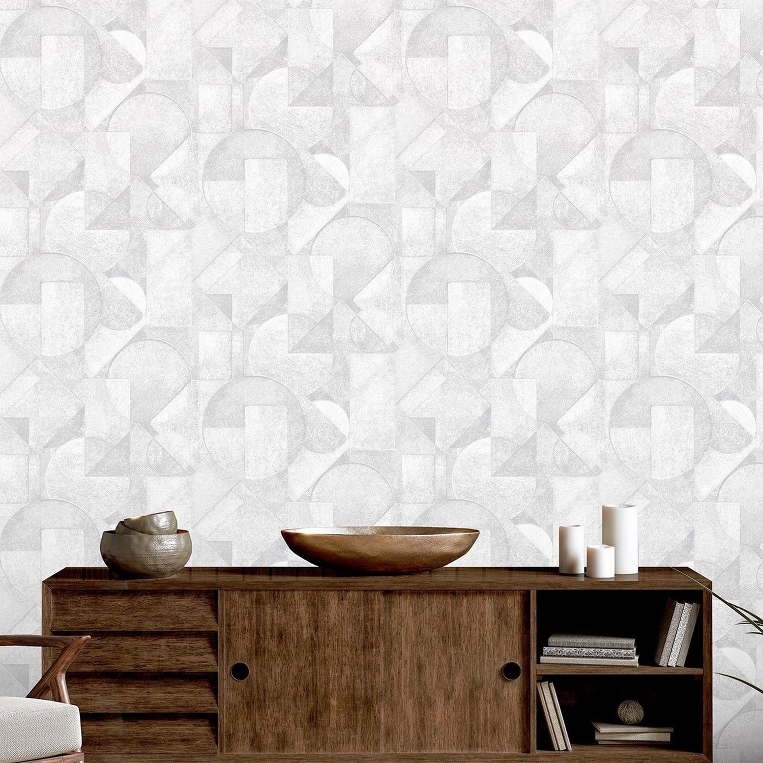 Комбинация различных геометрических фигур складывается в упорядоченный рисунок, в котором сочетаются движение и гармония. Игра цветовых оттенков и сдержанных спецэффектов образует выразительную связь между элементами, благодаря которой формы взаимодействуют друг с другом, создавая ритм и единство рисунка. Брутальная геометрическая композиция сделает пространство динамичным, атмосферным и современным.