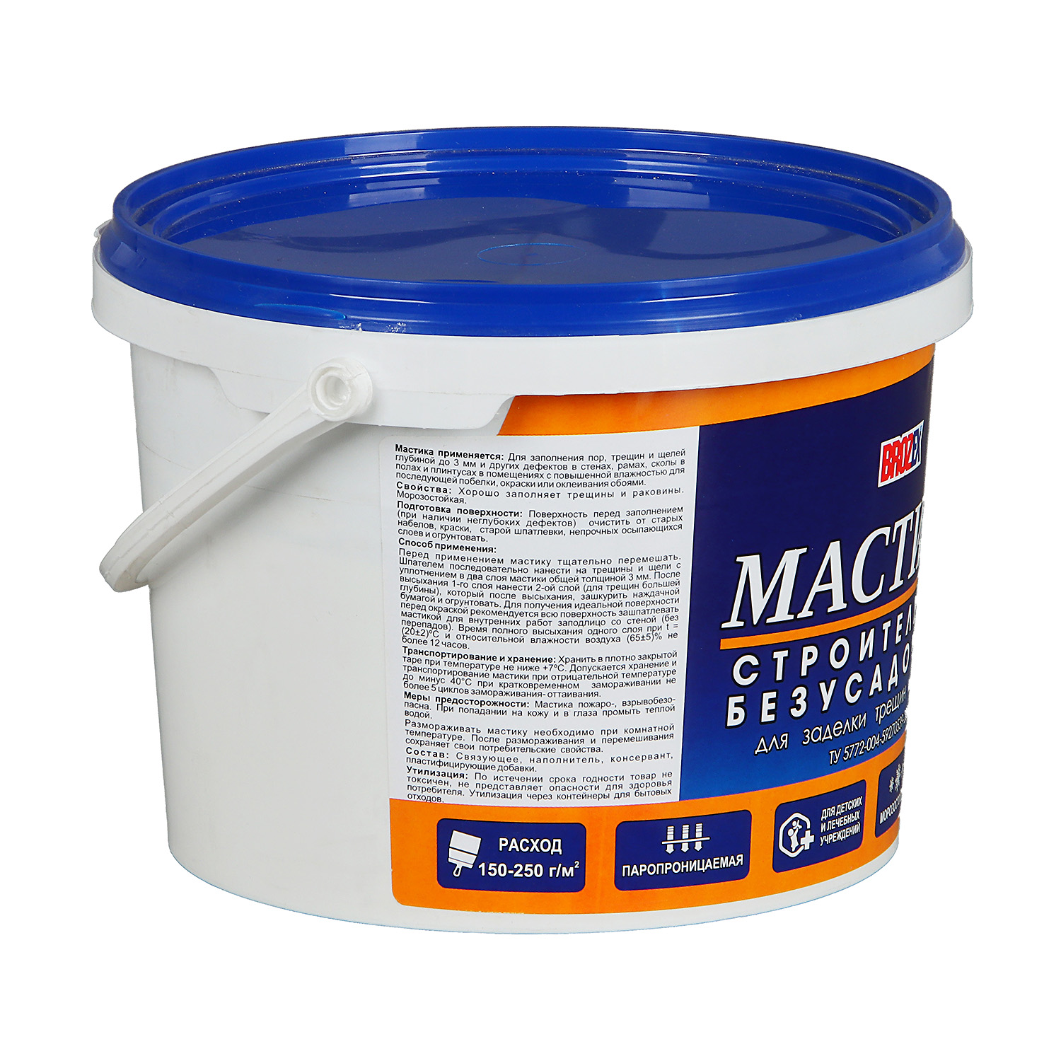 Мастика строительная безусадочная BROZEX 2.5 кг хорошо заполняет трещины, раковины и другие дефекты в стенах, рамах, полах, плинтусах под последующую побелку, окраску или оклеивание обоями. Образует ровное матовое долговечное покрытие.