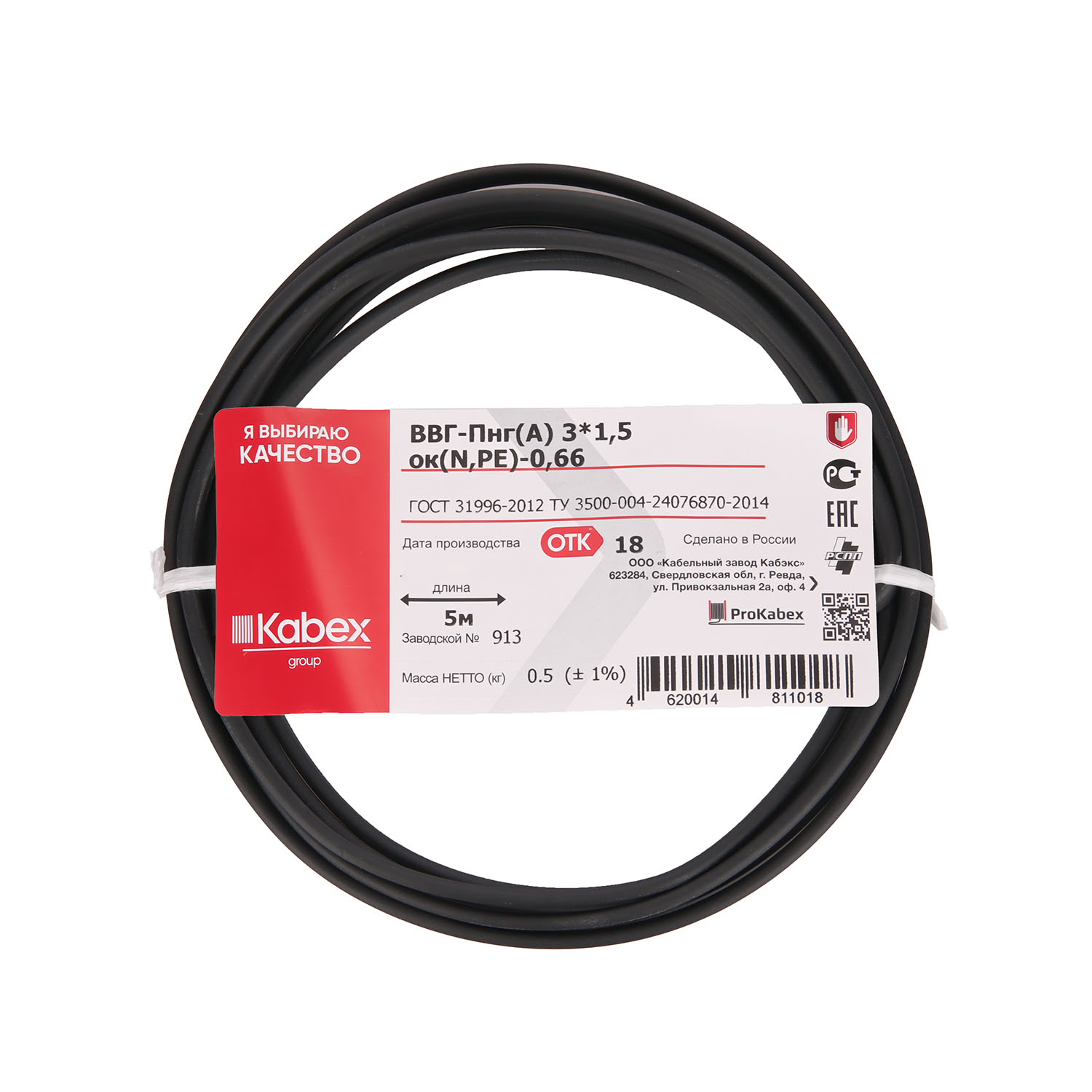 Кабель ВВГнг 3*1,5 (уп. 5м) ГОСТ *1