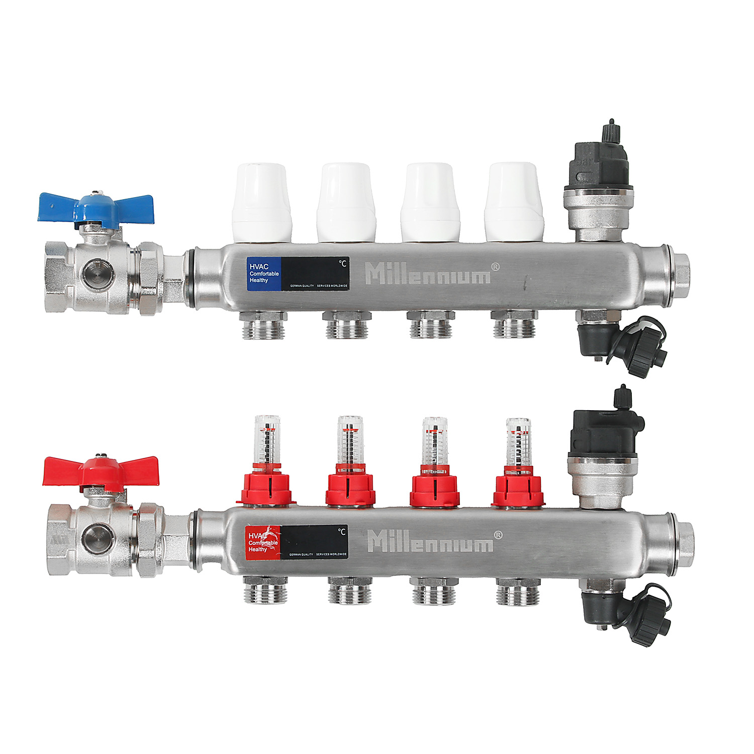 Коллекторная группа Millennium с расходомерами выполнена из нержавеющей стали, имеет регулировочные и термостатические вентили. Применяется при монтаже радиаторного отопления и теплых полов.