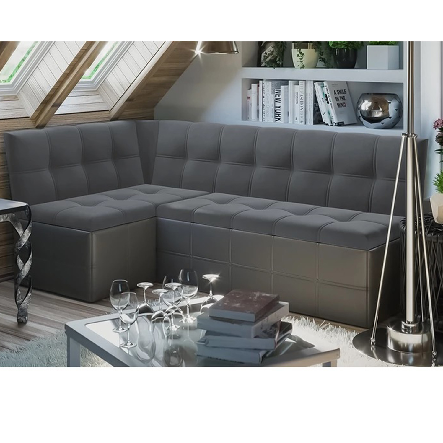 Скамья угловая со спальным местом исп. 2 Домино Кожзам Серый/Велюр Серый*1