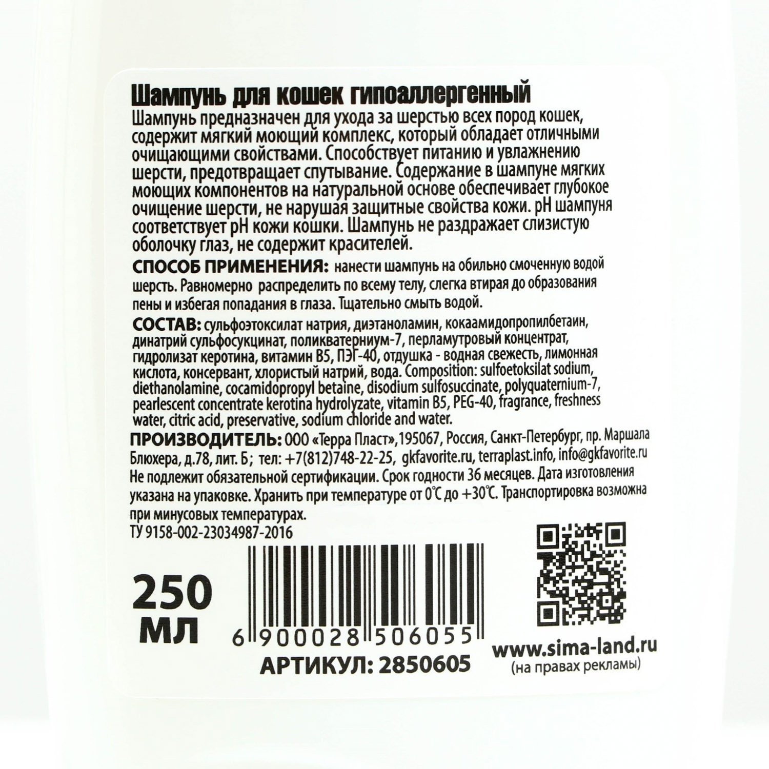 Шампунь "Пижон" гипоаллергенный, для чувствительной кожи, для кошек, 250 мл 2850605